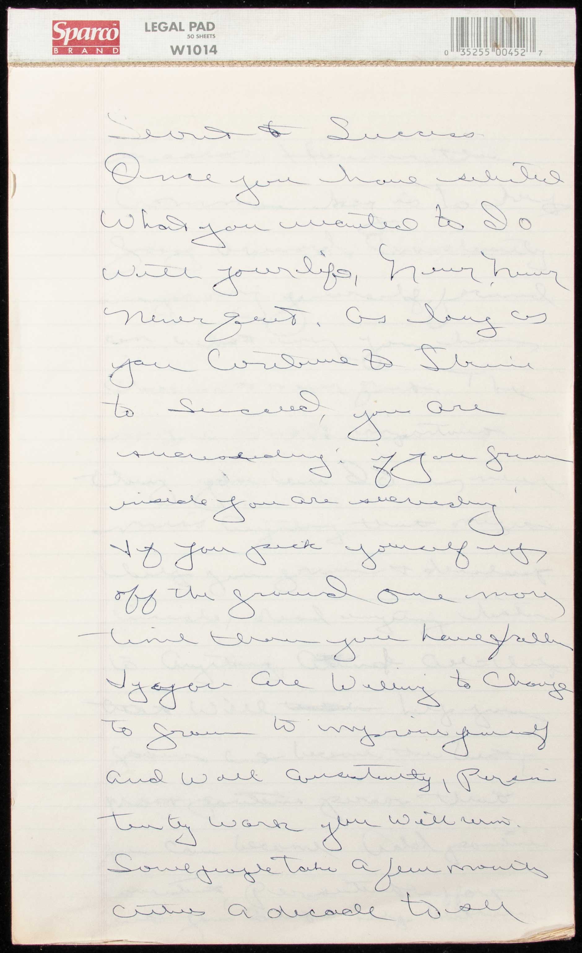 Description:Poignant Johnny Unitas handwritten "Secret to Success" manuscript. Pad of legal sized paper (8.5"x14") with the first two and half pages filled with a handwritten manuscript done by Johnny Unitas (not signed) which he titled, "Secret to Success." Exceptional content throughout reads in part, "Once you have (unreadable) what you wanted to do with your life never, never, never quit. As long as you continue to strive to succeed you are succeeding, If you grow inside you are succeeding, if you pick yourself up off the ground one more time than you have fallen, if you are willing to change, to grow, to improve yourself...you will win. Some people take a few months, others a decade to see success...The single most important thing you can do is never miss anything that might help you grow + develop inside, read everything, listen to anything...add positive, consistent, persistent effort...This is not the magic (unreadable) that you wanted to hear but who said success was easy." There is some light general handling and age related wear to the pad and an additional notations (names/phone numbers) written by Unitas on the last page of the manuscript. A fascinating glimpse into the viewpoint of one of the most lauded quarterbacks of all-time. Includes auction LOA from JSA and letter of provenance from the Unitas Family: EX