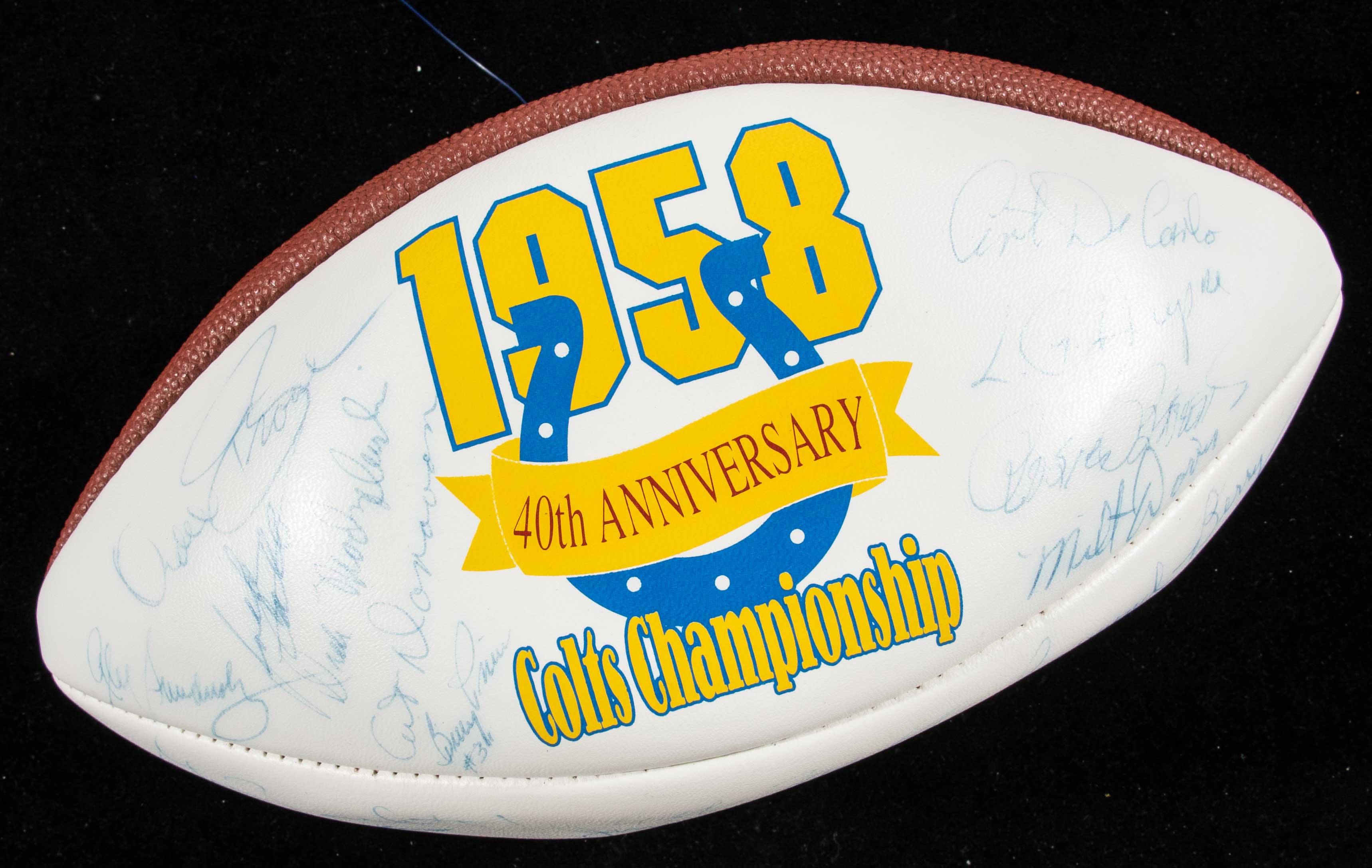 Description:1958 Baltimore Colts 40th Anniversary Reunion autographed football. Wilson white panel football with "1958 Colts Championship 40th Anniversary" logo on the side panel has been signed throughout by (22) team members. Notables include Johnny Unitas, Rosie Brown, Raymond Berry, Jim Parker, Lenny Moore, Kyle Rote, Gino Marchetti, and Art Donovan. Ink signatures rate 7 to 7/8 out of 10. Touch of air loss and there are a few minute scattered imperfections. Includes auction LOA from JSA and letter of provenance from the Unitas Family: EX-EX/MT