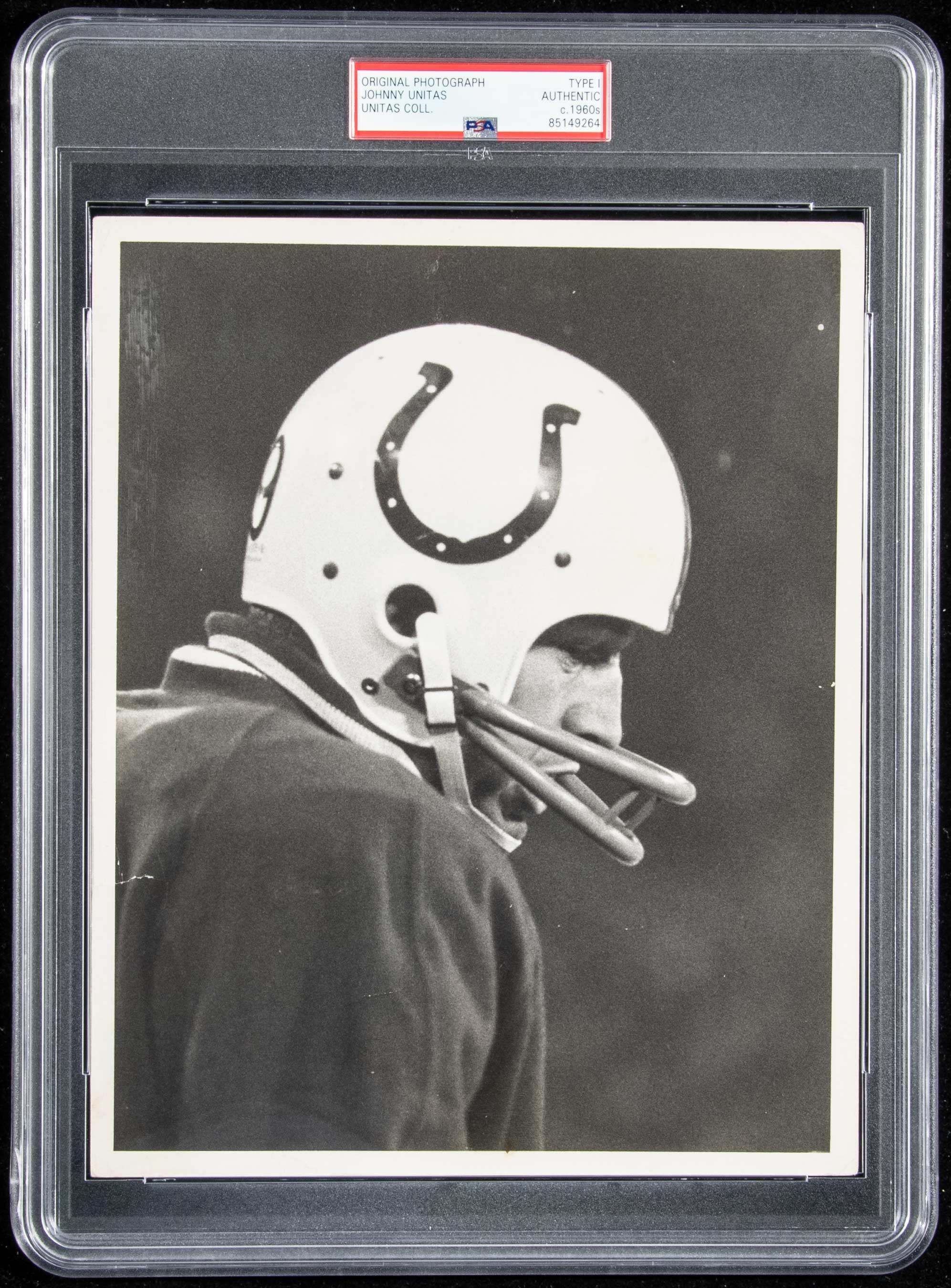 Description:Johnny Unitas photograph c.1960s (PSA "Type I"). Black and white 8"x10" photograph has been authenticated and encapsulated by PSA as a "Type I" with "Unitas Collection" noted on the holder. Mild scattered wear includes wrinkles and a small tear on the left edge. Includes letter of provenance from the Unitas Family: VG