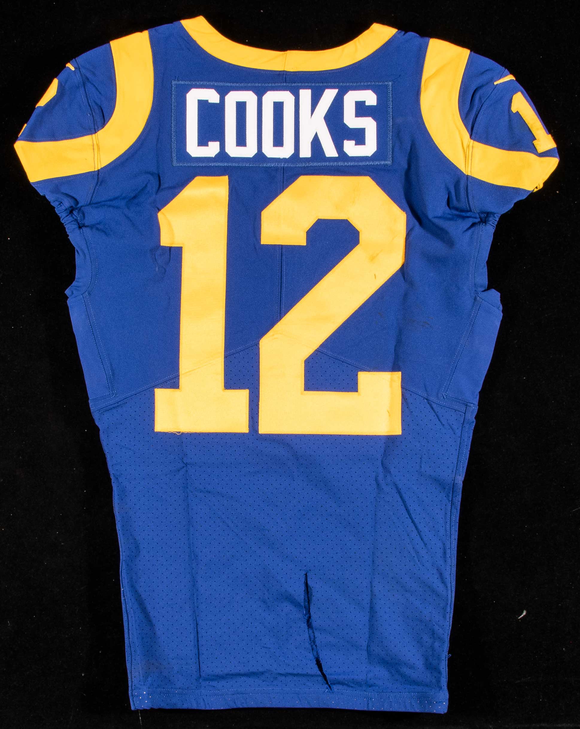 Description:10/27/2019 Brandin Cooks game worn Los Angeles Rams jersey. Nike "On Field" size 38 Rams #12 Brandin Cooks jersey with NFL 100 patch worn during their International Series game against the Bengals in London. Cooks played (3) snaps prior to leaving the game due to injury, but the jersey still shows extensive use with field stains and impact marks on the front and back. Includes NFL Auction COA from PSA/DNA, with matching serial #2N63548 sticker on the jersey: EX
