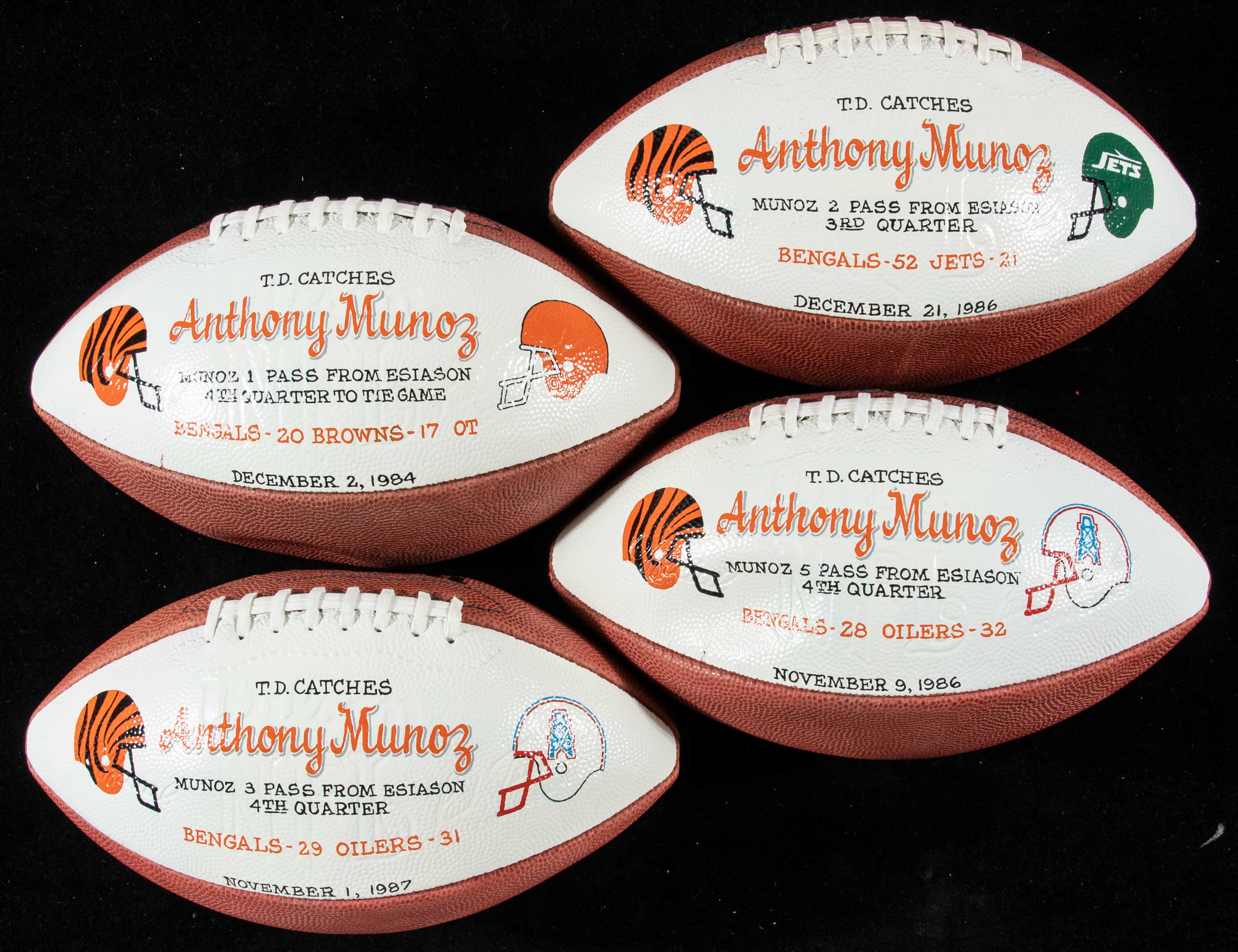 Description:Set of (4) Anthony Muñoz Cincinnati Bengals presentational footballs commemorating his record four touchdowns. Set of (4) Wilson P.Rozelle Official NFL footballs all have a white painted panel listing details from each of Anthony Muñoz's (4) career touchdowns. This is a record for Offensive Linemen that he shares with (6) other players. They are done in similar style to presentational game balls and all note the date, opponent, score, and Quarterback (all were passes thrown by Boomer Esiason). Touch of light scattered wear and some air loss. Includes letter or provenance from Anthony Muñoz: Overall EX