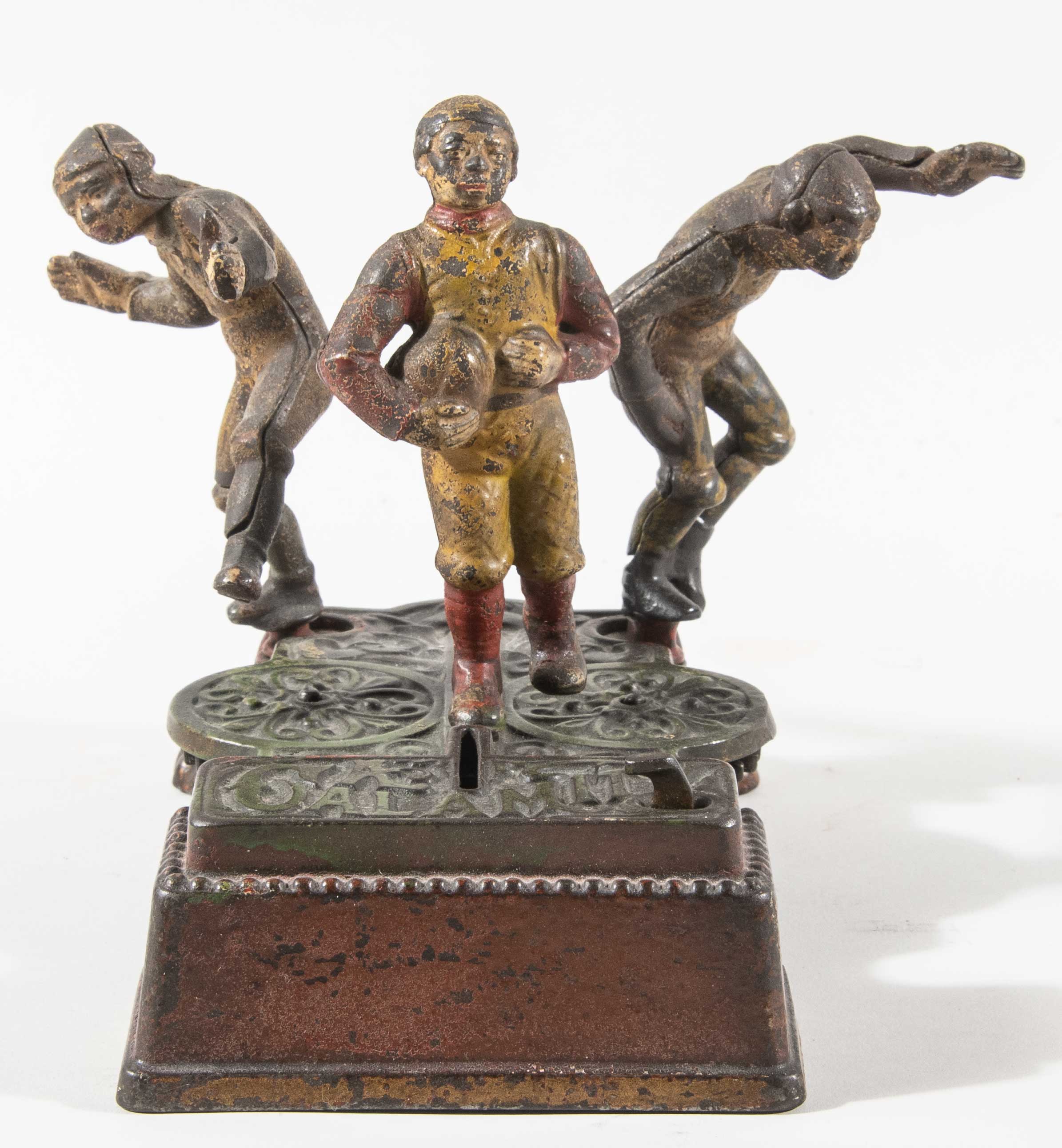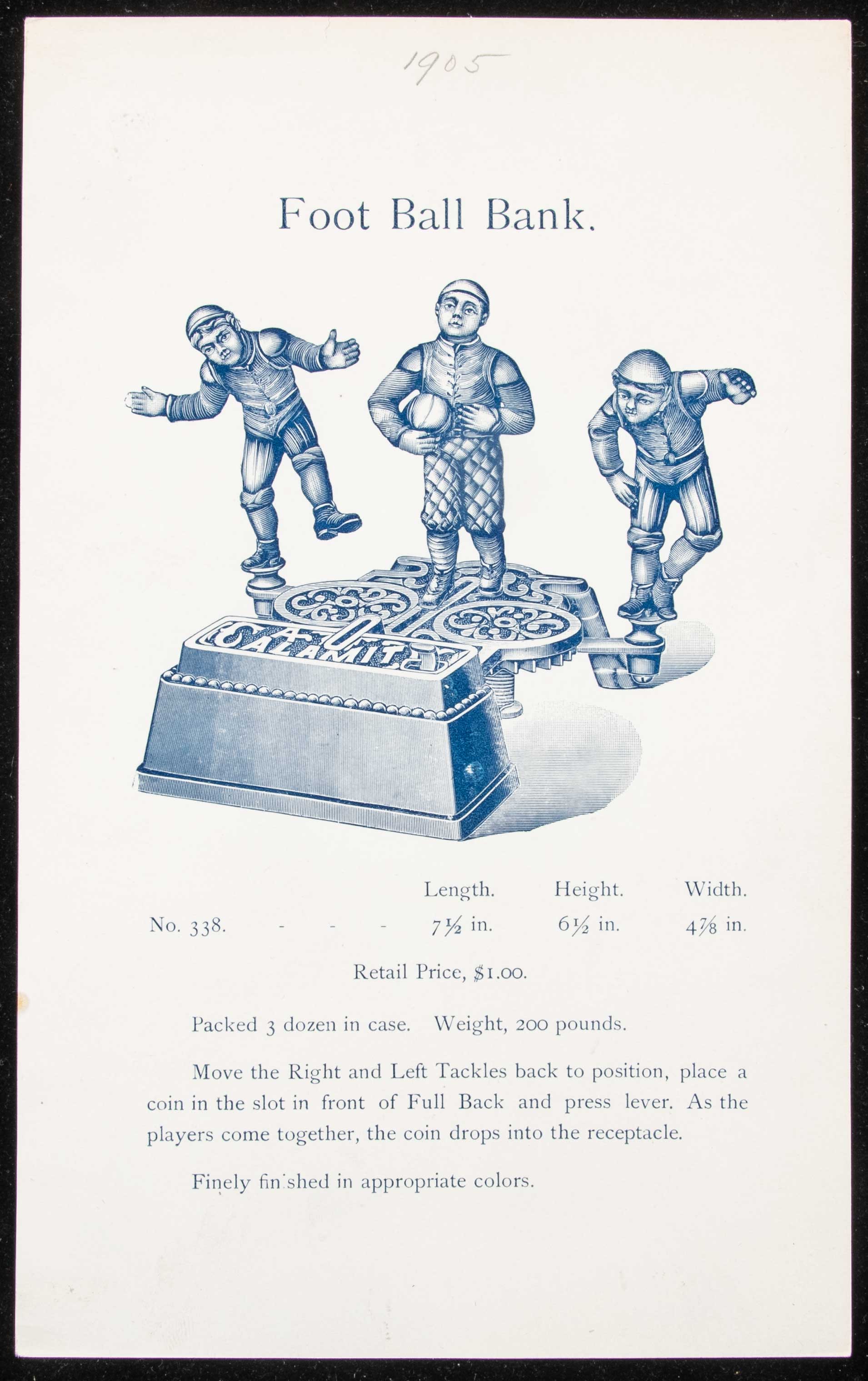 Description:Rare "Calamity" - Football mechanical bank c.1904, with period advertising sheet. Football themed mechanical bank features a trio of uniformed players which spring to action when a button is depressed. The middle figure holds a football and is tackled by defensemen on either side. Patinated surfaces retain small portions of the original paint and the bank is functional. Unmarked but known to have been made by J. & E. Stevens and includes a period 5"x9" paper stock advertising sheet (which may be a page removed for a catalog). Stevens made a series of mechanical banks in the period which include some of the more desirable within that niche of collecting. The Calamity bank is one of the rarest (this being the first example we have auctioned) and most desirable sports themed banks within that genre of collecting.