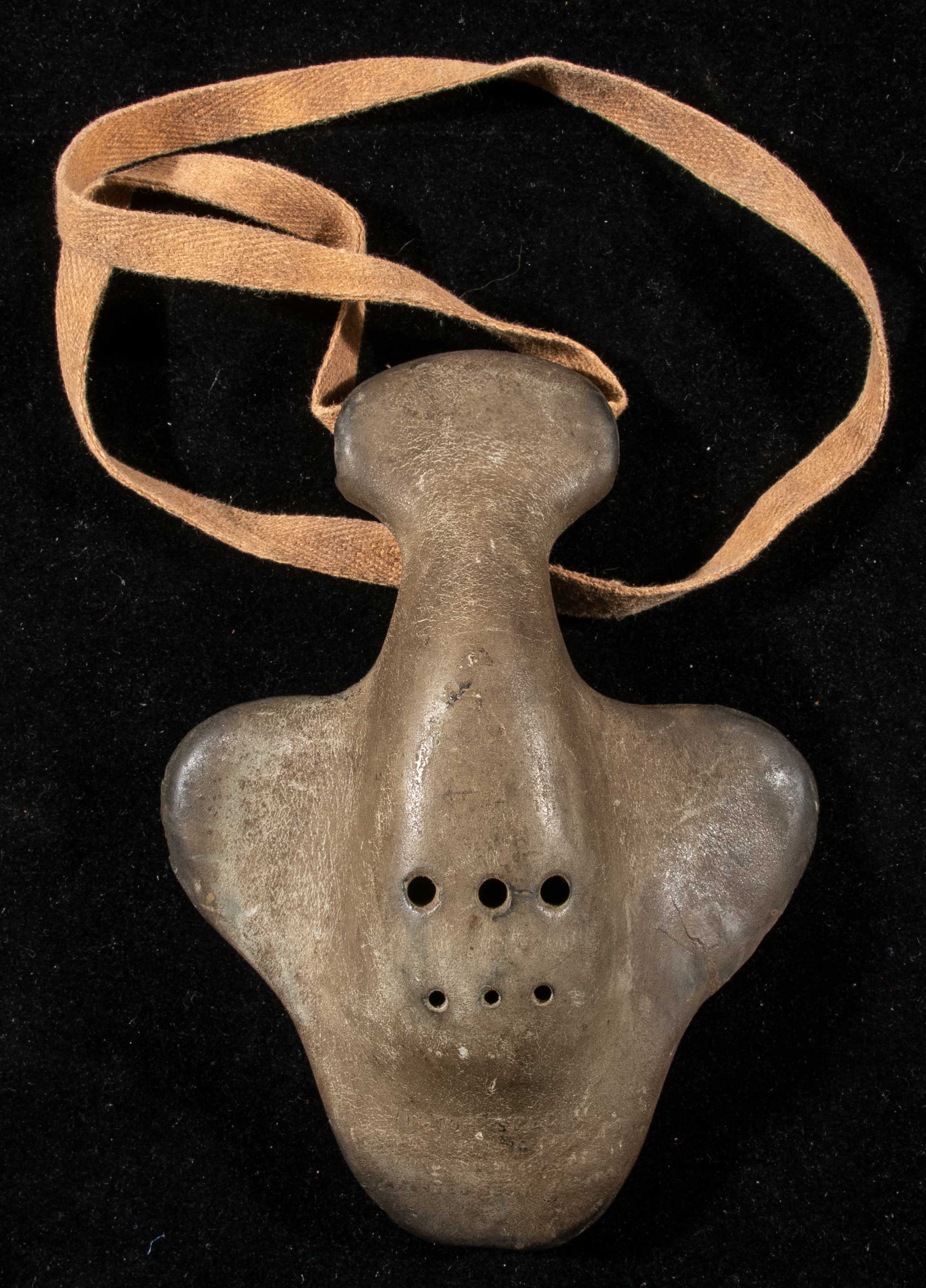 Description:Rare Victor Sporting Goods "batwing" nose guard c.1890s. Desirable early nose guard marked "Victor Sporting Goods" on the front with late 1891 patent date below. Use and some general age related wear throughout (along with mild discoloration). A small crack to one side may have been repaired long ago. Fine example of this desirable style for display with intact cloth strap: VG-EX