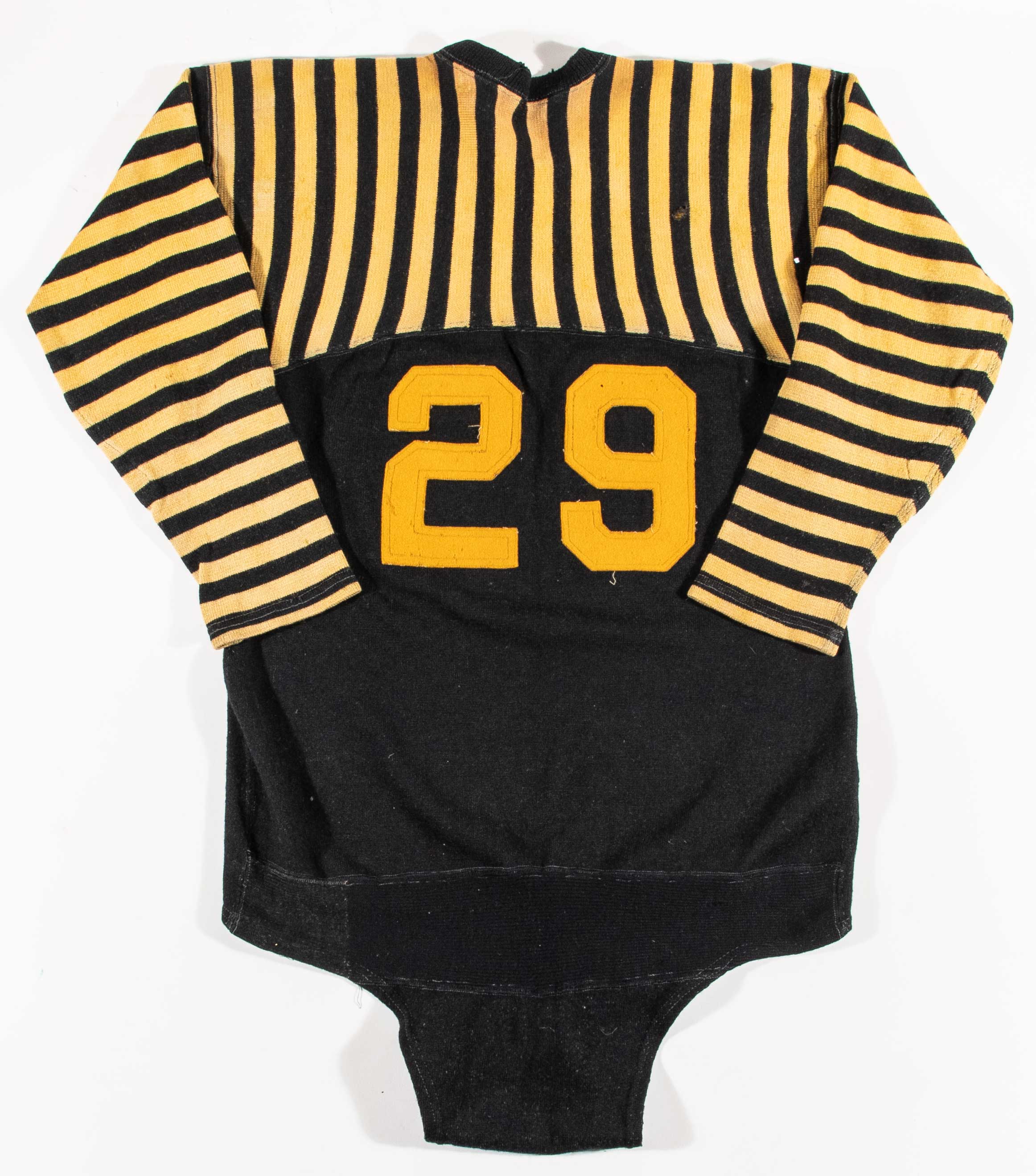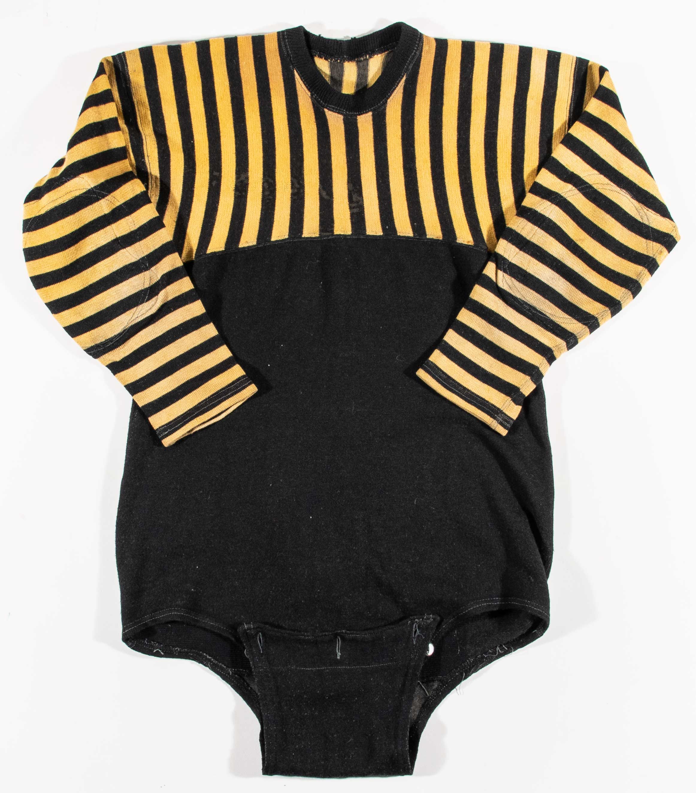 Description:Early striped football jersey c.1920-30s. Heavy gauge wool one piece jersey with extensive gold/black striping on front and back. Original gold felt "29" number affixed to the back with crotch piece at bottom of the shirt remaining intact. "McMillan Athletic Goods, Terry Haute, IN" tag affixed to crotch flap along with "42" size tag. Evident use throughout with fine eye appeal: VG-EX
