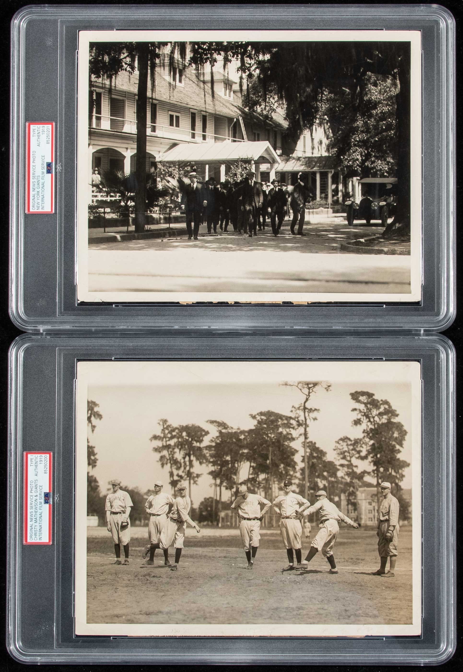 Description:Lot of (2) Christy Mathewson New York Giants related photographs c.1919 (PSA/DNA Type I). Pair of 8"x10" black and white images to include group of New York Giants players in uniform warming up on field with Mathewson and a candid image of group of Giants player walking in street clothes during spring training in Florida. Each photo shows some typical surface wrinkling with International Film Service stampings on the back. Encapsulated by PSA/DNA (Type I) and includes Mathewson Collection certificate of provenance : VG-EX
