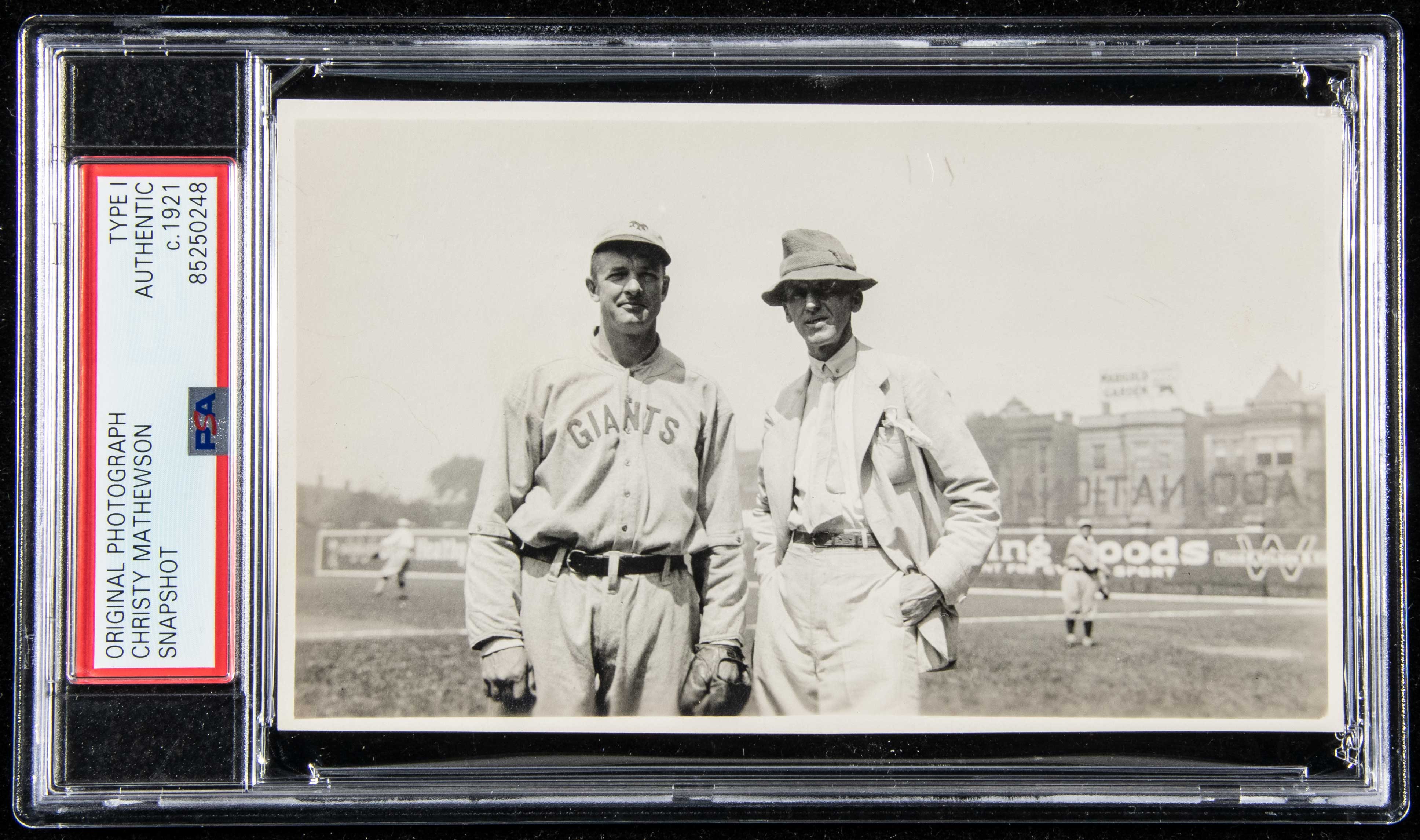Description:Christy Mathewson photograph c.1921 (PSA/DNA Type I). Sepia tone 3 1/2"x5 1/2" image of Mathewson posed in New York Giants uniform standing alongside of a gentleman in street clothes. Fine condition with light wear. Encapsulated by PSA/DNA (Type I) and includes Mathewson Collection certificate of provenance: EX-MT