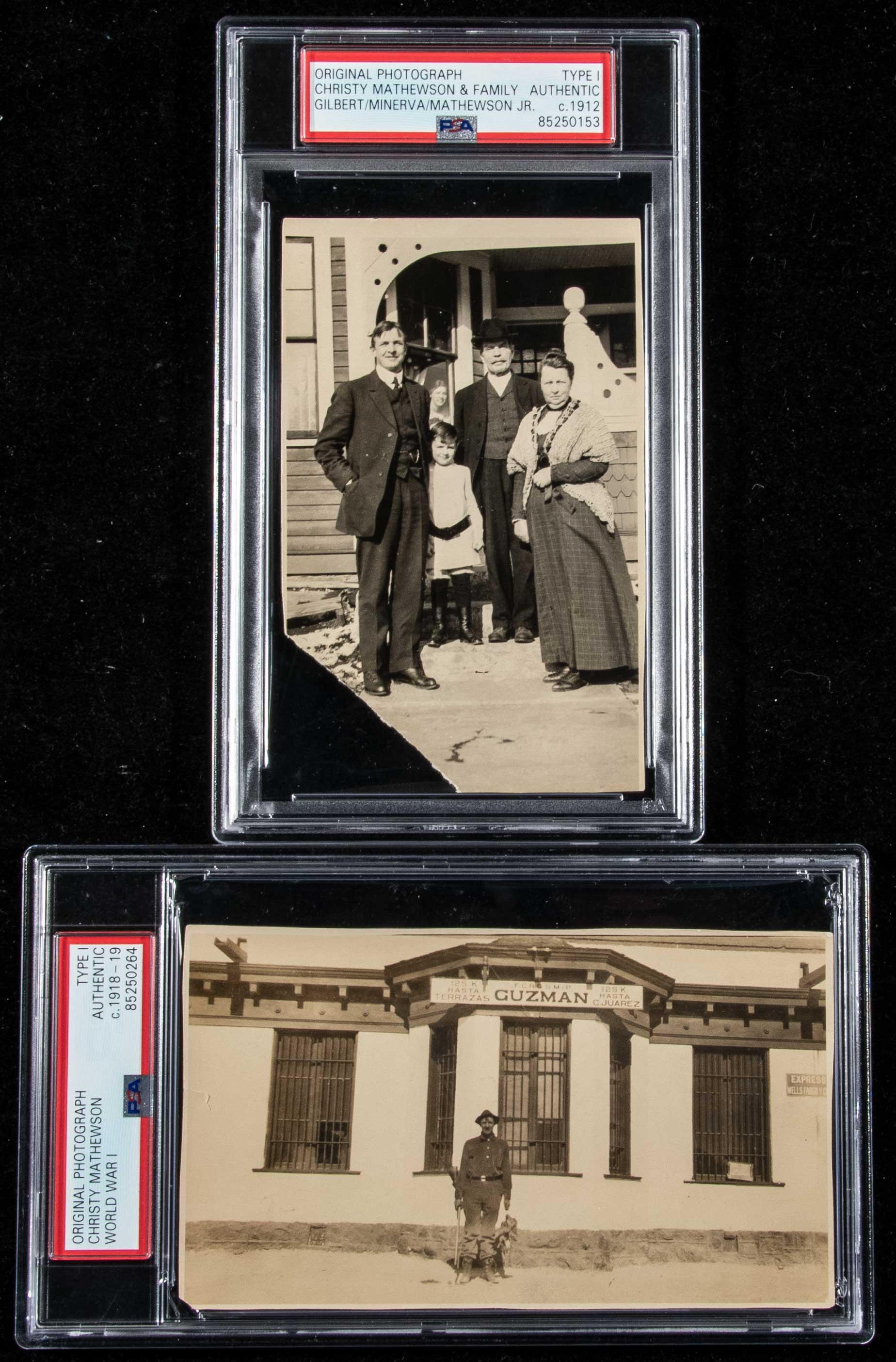 Description:Lot of (2) Christy Mathewson photographs c.1910-15 (PSA/DNA "Type I"). Pair of photographs including an 3"x5" image showing Mathewson with Christy Jr. and his parents (Gilbert and Minerva) outside of the Factoryville home. A handwritten identifier on the back notes year as "1912." Portion missing at lower right corner; very slightly larger image showing Mathewson while on a trip to Mexico with handwritten identifier on the back noting that he was hunting quail "between revolutions." Mild scattered wear and both have been authenticated and encapsulated by PSA/DNA with "Type I" designation. Includes Mathewson Collection certificate of provenance: GD and VG/EX