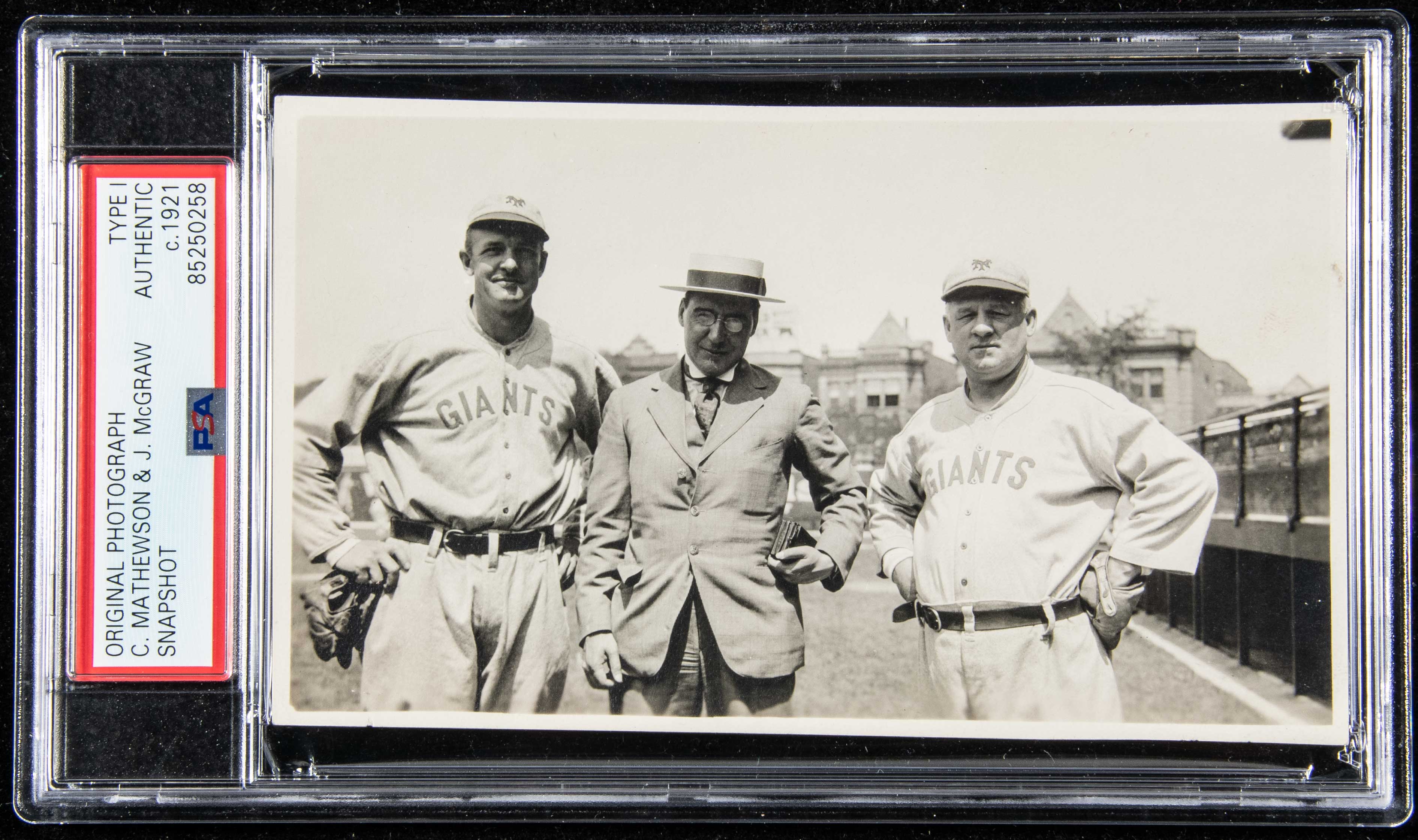 Description:Christy Mathewson and John McGraw photograph c.1921 (PSA/DNA "Type I"). Sepia tone 3 1/2"x5 1/2" image of Mathewson posed in New York Giants uniform standing alongside of manager John McGraw and a gentleman in street clothes. Fine condition with light wear. Encapsulated by PSA/DNA (Type I) and includes Mathewson Collection certificate of provenance: EX-MT