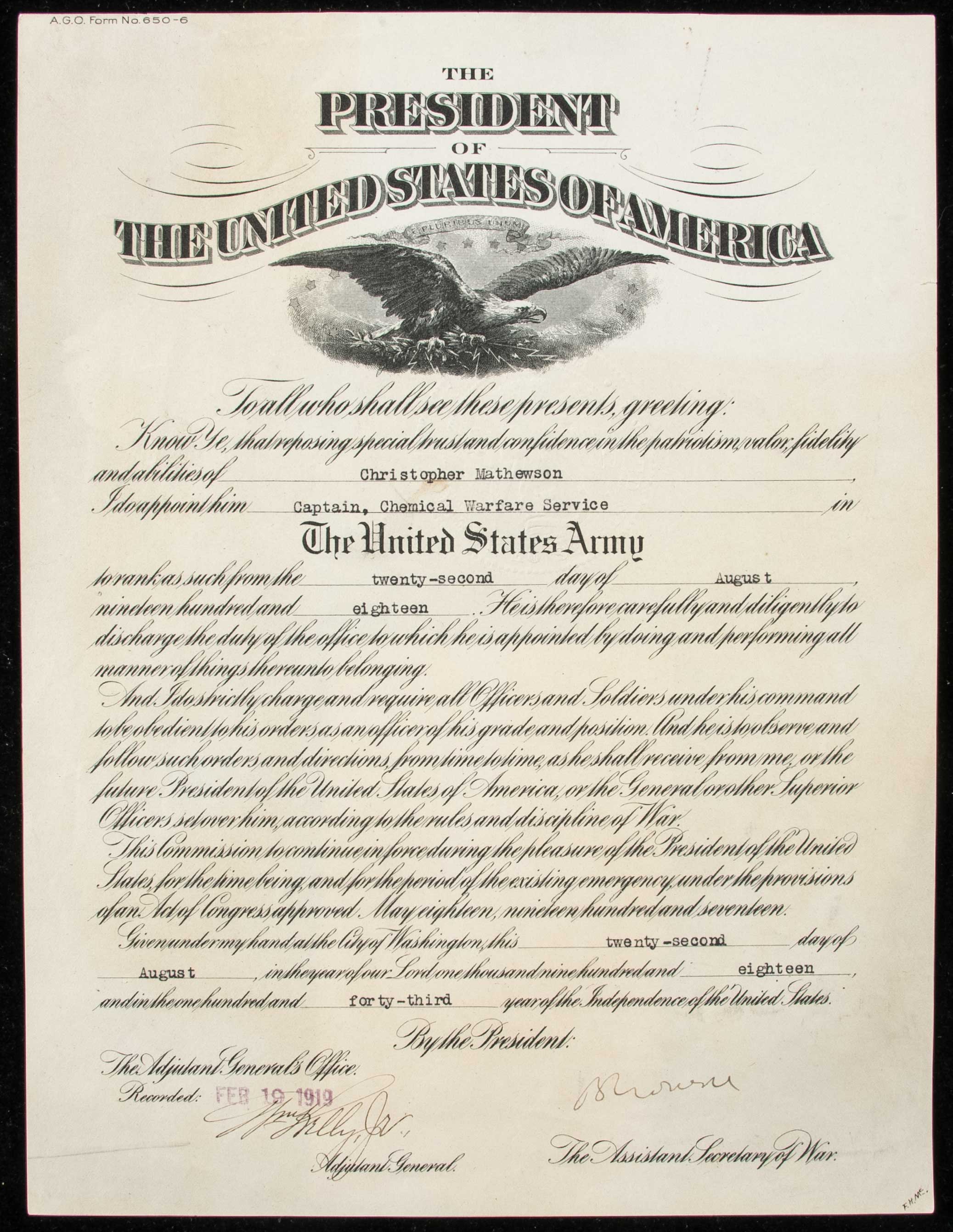 Description:Important August 22, 1918 Christy Mathewson United States Army appointment as "Captain, Chemical Warfare Service." Historically significant United States Government issued document which appointed "Christopher Mathewson" as "Captain, Chemical Warfare Service" effective August 22, 1918. Despite opposition from his wife Jane, Christy Mathewson had enlisted in the Armed Forces feeling it his duty to serve during World War I. He was appointed a Captain in the newly formed Chemical Warfare Service along with Ty Cobb. It would be a short lived adventure as the armistice which brough about an end to the global conflict was signed on November 11th of the same year. It would still, however, prove to be a fateful period in Mathewson's life. During a training exercise shortly after his arrival in France, he was accidentally exposed to a chemical gas which damaged his lungs and would allow the tuberculosis which eventually killed him to take a firmer hold. Heavy paper stock 8"x10.5" document was mild wrinkling and some other handling wear/toning throughout. There is a small impression from a paperclip which secured an included card reading "Please acknowledge receipt of commission" to the top. Includes Mathewson Collection certificate of provenance: VG-EX