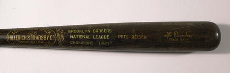 1941 Brooklyn Dodgers NL Champions commemorative black bat. Louisville Slugger 125 model black bat with gilt names of the NL Champion Dodgers incl. Reese, Durocher, and Medwick. Bat has some surface wear incl. scratching: VG
