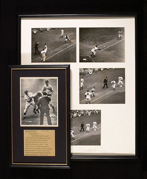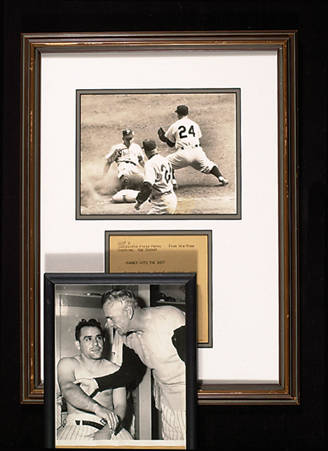 Lot of (10) matted and framed display of vintage baseball photography c.1940s-50s. Total of (10) vintage black and white 8"x10" photographs. Majority are action scenes incl. Stengel, Berra, Coleman, Rizzuto, and Hamner: EX
