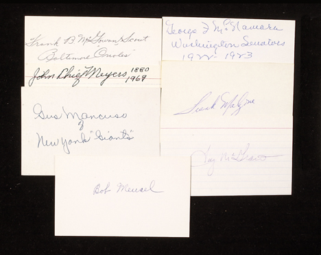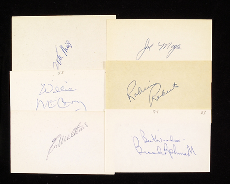 Lot of baseball HOF'er auto. 3"x5" index cards to include: (13) Brooks Robinson, (46) Robin Roberts (several vintage signed), (46) Joe Morgan (incl. many vintage signed), (7) Eddie Mathews, (8) Willie McCovey, and (2) Willie Mays (one is vintage).