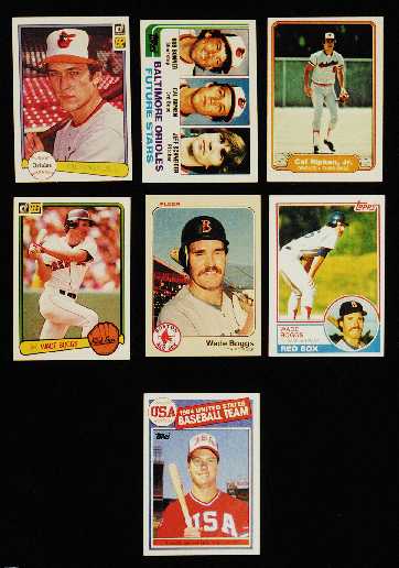 Lot of six baseball rookie cards: Wade Boggs-one each for 1983 Topps, Donruss, and Fleer: NM and Cal Ripken-one each for 1982 Topps, Donruss, and Fleer: NM