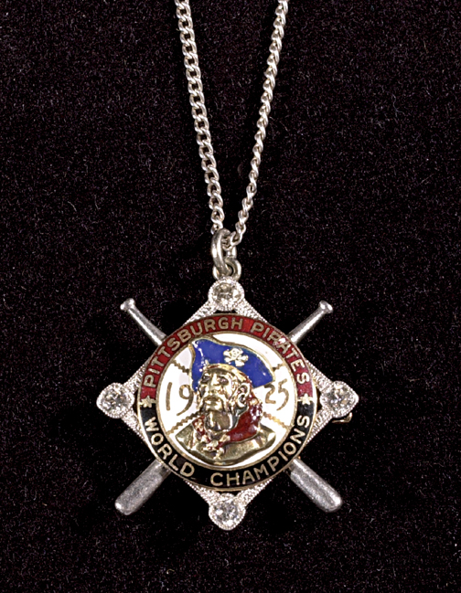 | Description: Scarce 1925 Pittsburgh Pirates World Championship pin. Absolutely stunning piece awarded to Jack Onslow as coach for the 1925 World Champion Pirates. Silver crossed bats adorn the background of a silver diamond shaped framework having four inset diamonds at the "base" corners. Mounted on the front is a finely detailed three dimensional enameled Pirates mascot having inlaid gold lettering, "Pittsburgh Pirates World Champions 1925". Reverse is inscribed "Presented by Baseball Commissioner to John J. Onslow". "B" hallmark is impressed on the back of one bat. Back has both a bar style pin and small clasp at the top for a chain. Onslow served as a coach for the Champion Pirates and this was one of the more cherished items that he kept in his collection. First example of this highly appealing early Championship award that we have seen come into the marketplace. Includes letter of provenance from the Onslow family: NM |
