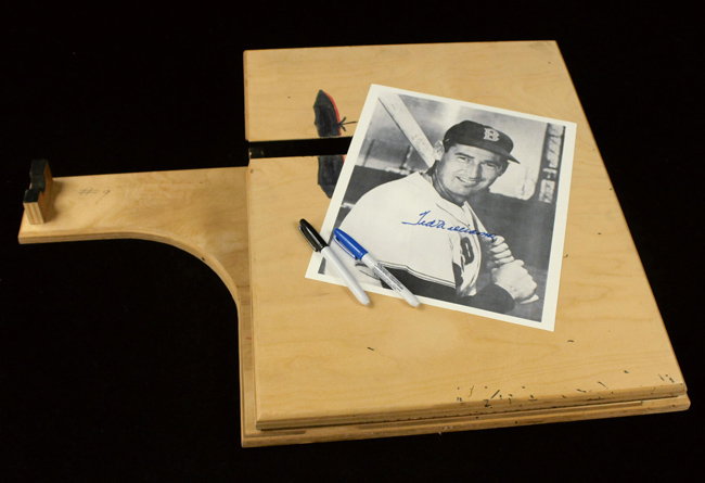 Description:Uniquely constructed bat signing desk made for Ted Williams and Williams signed image (EX/MT) Large wooden apparatus made especially for Ted Williams to aid in the signing of baseball bats. Upper hinged portion lifts to reveal felt covered half circles for the bat to sit in. When closed the bat is held straight and in position with a window allowing for signing to take place. Lid has scattered marker marks and an area which has been colored in, presumably so that Ted knew where to begin the signature. His jersey "#9" is also written on the desk. Very well constructed and measures approx. 30"x22.5" at extremes. Fitting of his perfectionist nature, it is not surprising that Ted took such steps to ensure the quality of his autograph. Includes 11"x13" printed image which has been signed across the front, "Ted Williams", a pair of Sharpie markers which were found within Williams personal effects, and certificate of provenance from Claudia Williams: EX/MT