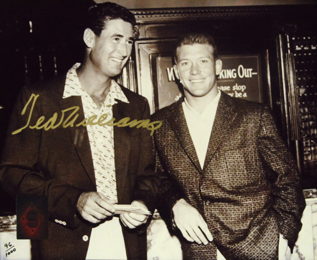 Description:Ted Williams signed limited edition 8"x10" photograph with Mickey Mantle (NM-MT) Sepia toned photograph has been signed on the front, "Ted Williams." Gold paint pen signature rates 9/10 out of 10. Hand numbered 96/1,000. Includes certificate of provenance from Claudia Williams and has Green Diamond authentication hologram affixed: NM-MT