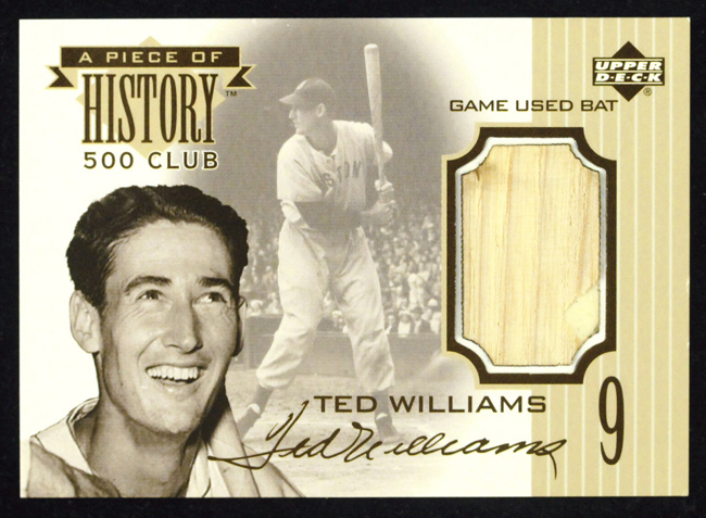 Description:Ted Williams 1999 Upper Deck game used bat insert card (NM). Card contains a piece of bat used by Ted Williams. Includes certificate of provenance from Claudia Williams: NM