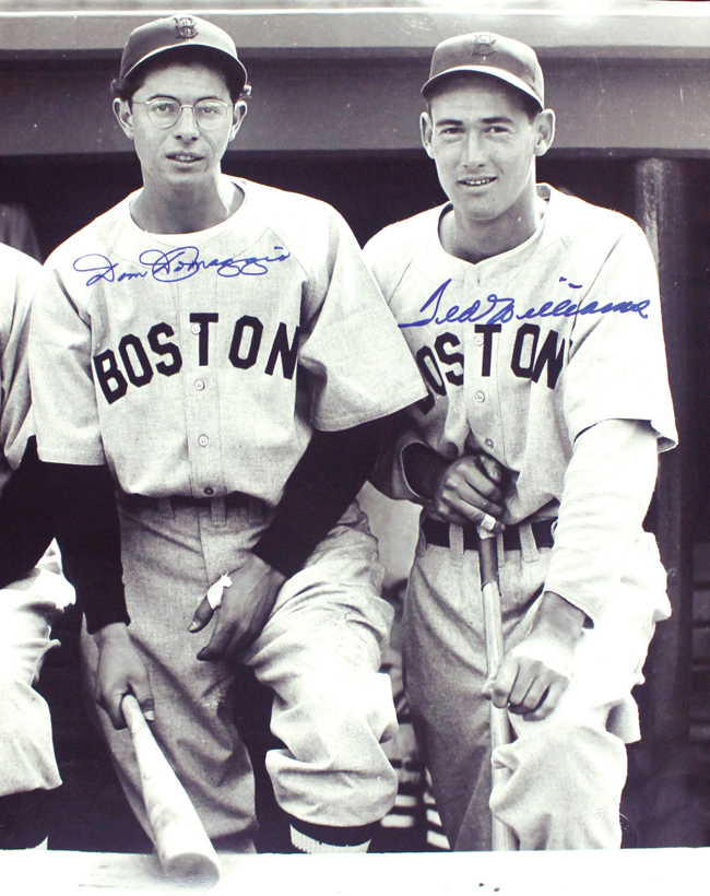 Description:Ted Williams and Dom DiMaggio signed large format photograph (Photo NM, Sigs. NM-MT) Black and white 16"x20" photograph printed on high quality thick stock has been signed on the front, "Ted Williams" and "Dom DiMaggio." Blue marker signatures rate 9/10 out of 10. Photo itself has very minor scattered wear, none of which has effect on visual appeal and all would be matted out when framed for display. Has raised Brearley seal at lower right and stampings on back. Includes letter of provenance from the Brearley Family: Photo NM, Sigs. NM-MT ($300-$500)