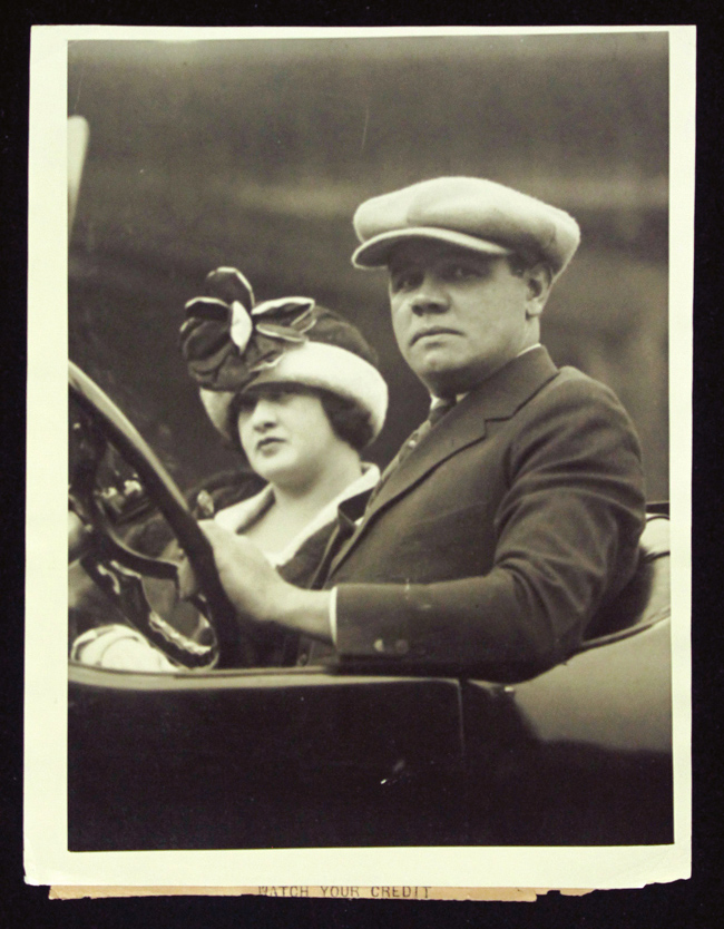 Description:"King of Swat and Mrs. Ruth" Babe Ruth press photograph c.1922 (EX-EX/MT) Period 6.5"x8.25" sepia toned photograph having original paper caption affixed to back with the title "King of Swat and Mrs. Ruth Operate On At Same Time." Dated 1922. Photo has "International Newsreel" stamping on back. Hint of light toning and wear: EX-EX/MT ($200-$400)