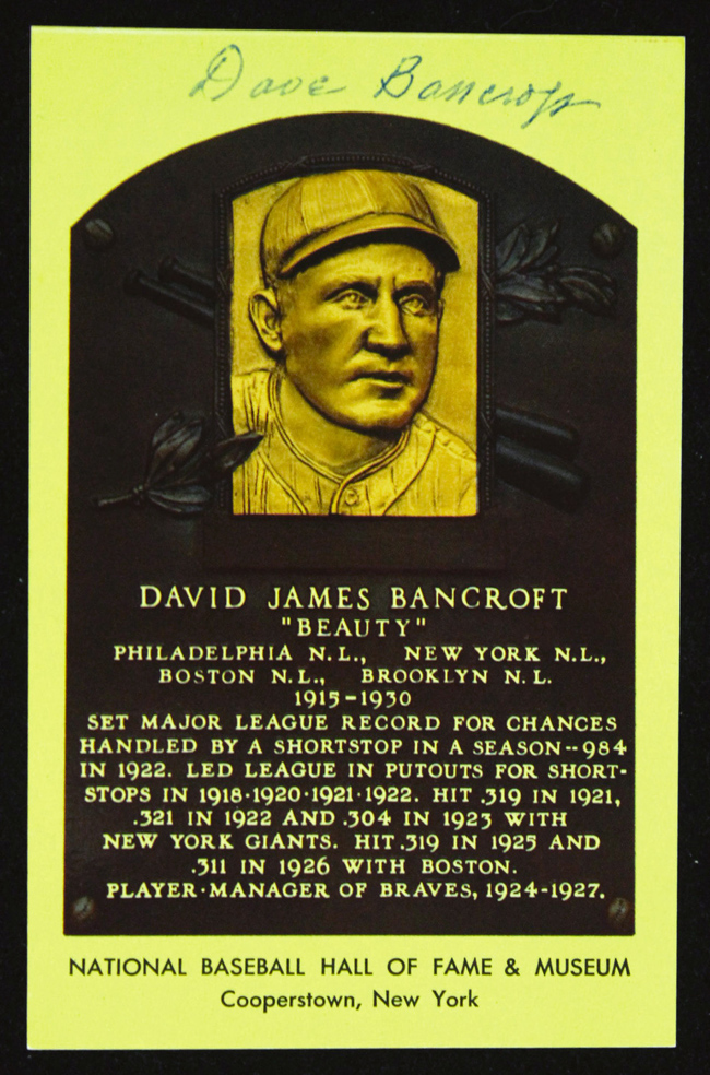 Description:Rare Dave Bancroft front signed yellow Hall of Fame postcard by Curteichcolor (NM). Desirable signed postcard being of the most difficult to find signed within this popular series. Signed at the top "Dave Bancroft" in blue ink rating 7/8 out of 10. Little to no mentionable wear to card: NM ($2,000-$3,000)