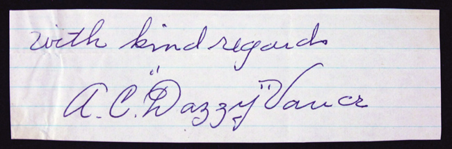 Description:Dazzy Vance autograph (Signature NM-MT). Paper slip measuring 1.75"x5.5" has been signed on the front, "with kind regards, A.C. Dazzy Vance." Blue ink signature rates 8/9 out of 10. Very light age toning and scattered wear: Signature NM-MT ($200-$400)