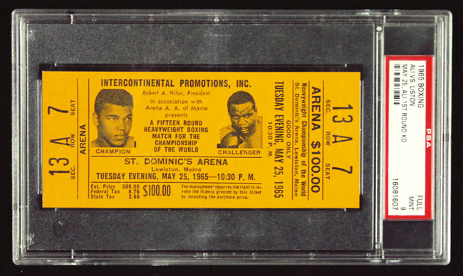 Description:High grade 1965 Muhammad Ali vs. Sonny Liston full ticket (PSA Mint 9). Unused ticket from the famed "Phantom Punch" fight in which Liston fell to the mat midway through the first round with Ali taunting him to "get up and fight, sucker!" In the ensuing confusion the bout was stopped and Ali named the winner. Very well preserved with little to no evident wear. Encapsulated by PSA and graded: PSA Mint 9 ($750-$1,250)
