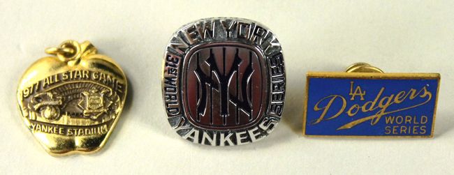 Description:1965 Dodgers World Series press pin, 1977 All Star Game press charm, 1977 Yankees World Series press pin (EX-EX/MT). Includes 1965 Los Angeles Dodgers World Series press pin marked Balfour" on the back (EX/MT); 1977 All Star Game press charm marked "Balfour" on the back (EX, green foam stain on back); and 1977 New York Yankees World Series press pin marked "Balfour" on the back (EX/MT, small green foam stains on the back). Range: EX-EX/MT