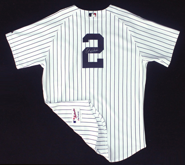 Description:Derek Jeter signed New York Yankees jersey (very high quality professional style tagged 2006) (NM). Pinstriped jersey with interlocking "NY" logo on chest. Back number "2" has been signed "Derek Jeter" in silver paint pen rating 8 out of 10. Jersey has "Majestic" manufacturers tag on front tail with adjacent year "2006" and size "48" flag tags. Similar in almost all regards to that which is issued on the professional level with exception of the Majestic logo which is present on sleeve: NM ($250-$500)