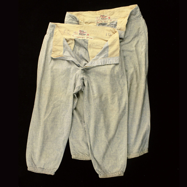 Description:Lot of (2) 1960 St. Louis Cardinals professional model pants (EX, usage wear). Includes Rawlings Hall of Fame Flannel size 36 pants with "Pollet 60 25 ins" strip tag embroidered below the inner waist, along with "SET 1 1960" flag tag; and Rawlings Hall of Fame Flannel size 34 pants with "Cannizzaro 60 25 ins" strip tag embroidered below the inner waist, and "Grammas 10" written on the inner waist in black marker. Both show moderate usage and wash wear, with light staining visible: EX