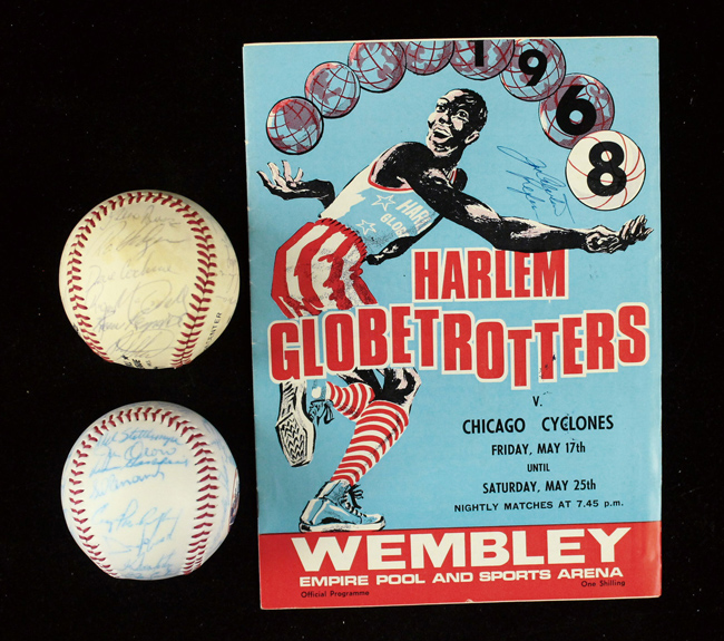 Description:1983 and 1986 New York Mets team signed baseballs, plus Harlem Globetrotters multi-signed program (EX-NM). Incl. 1968 Globetrotters program signed by Meadowlark Lemon, Curly Neal, and referee Joe Celentano (EX/MT); C.Feeney NL ball (toning) signed by (24) members of the 1983 Mets including George Bamberger, Tom Seaver, George Foster, Mookie Wilson, Rusty Staub, Jesse Orosco, Wally Backman, Roger McDowell, and others; and Mets logo ball signed by (25) members of the 1986 Mets (likely signed at spring training based on the signatures) including Gary Carter, Keith Hernandez, Wally Backman, Dwight Gooden, George Foster, Lenny Dykstra, Mookie Wilson, Bob Ojeda, Sid Fernandez, Roger McDowell, Jesse Orosco, and others. Signatures rate 5/6 to 9 (avg 7/8) out of 10: EX-NM