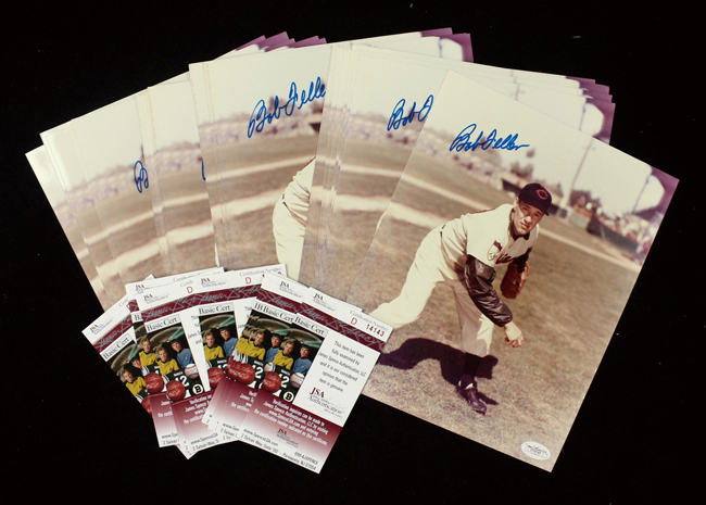 Description:Lot of (20) Bob Feller signed 8"x10" photographs, JSA (NM-NM/MT). Feller signed each photo in blue marker. Signatures rate 8/9 to 10 out of 10. Each comes with COA from JSA (serial #ed sticker is affixed to each): NM-NM/MT