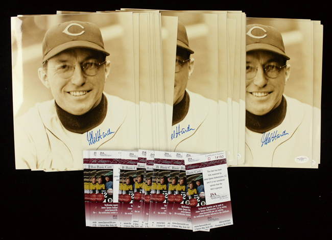 Description:Lot of (50) Mel Harder signed 8"x10" photographs, JSA (NM-NM/MT). Harder signed each photo in blue marker. Signatures rate 8 to 10 out of 10. Each comes with COA from JSA (serial #ed sticker is affixed to each): NM-NM/MT