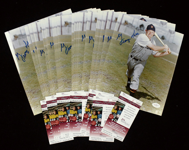 Description:Lot of (25) George Kell signed 8"x10" photographs, JSA (NM-NM/MT). Kell signed each photo in blue marker. Signatures rate 8/9 to 10 out of 10. Each comes with COA from JSA (serial #ed sticker is affixed to each): NM-NM/MT