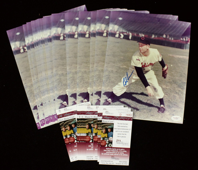 Description:Lot of (26) Bob Lemon signed 8"x10" photographs, JSA (NM-NM/MT). Lemon signed each photo in blue marker. Signatures rate 8/9 to 10 out of 10. Each comes with COA from JSA (serial #ed sticker is affixed to each): NM-NM/MT