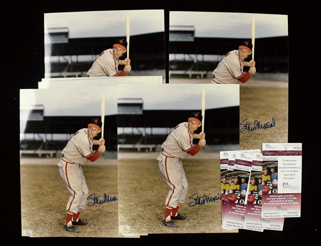 Description:Lot of (7) Stan Musial signed 8"x10" photographs, JSA (NM-NM/MT). Musial signed each photo in blue marker. Signatures rate 3/4 (one is significantly smudged) to 10 (avg 8/9) out of 10. Each comes with COA from JSA (serial #ed sticker is affixed to each): NM-NM/MT