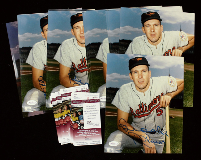 Description:Lot of (20) Brooks Robinson signed 8"x10" photographs, JSA (NM-NM/MT). Robinson signed each photo in blue marker. Signatures rate 8 to 10 out of 10. Each comes with COA from JSA (serial #ed sticker is affixed to each): NM-NM/MT