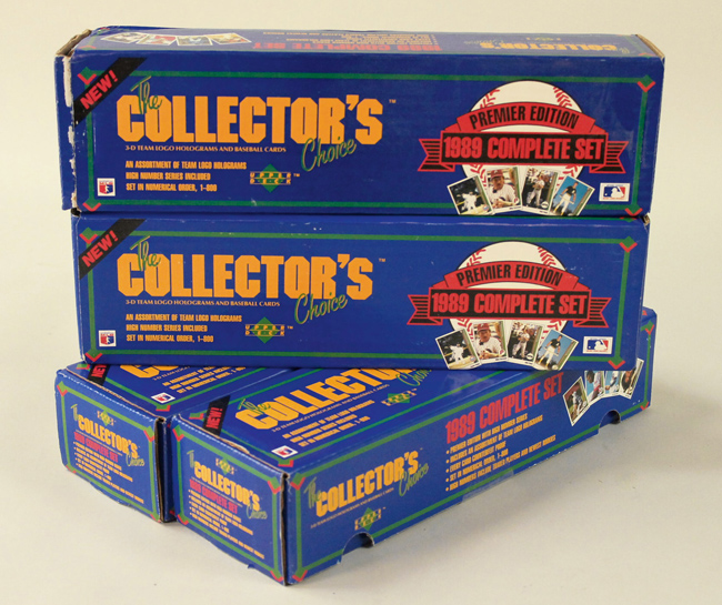 Description:Lot of (4) 1989 Upper Deck factory sets (NM-MT). Factory stickers remain affixed over the opening of each box. Boxes show areas of handling wear (the joint one side of one box is loose), but it is presumed that the cards inside remain in high grade condition: NM-MT