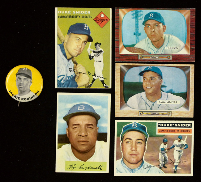 Jackie Robinson pin, plus (5) Brooklyn Dodgers stars & HOFers baseball cards from 1954-1956 (VG-NM). Incl. c.1950s 1.75" Jackie Robinson PM10 pin (EX, yellow variation); 1954 Bowman #90 Roy Campanella (VG); 1954 Topps #32 Duke Snider (VG); 1955 Bowman #s 22 Campanella (VG-VG/EX), 158 Hodges (VG/EX); and 1956 Topps #150 Snider (EX/MT-NM). Range: VG-NM