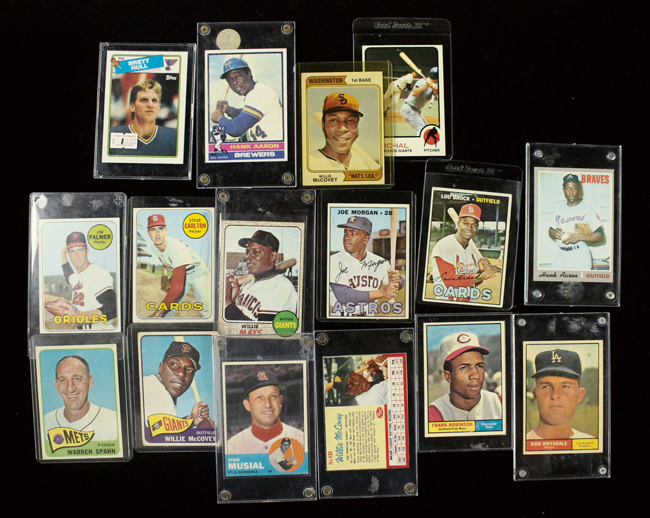 Lot of (15) HOFers baseball cards from 1961-1976, plus approx. (3000) other cards (GD-MT). Incl. 1961 Topps #s 260 Don Drysdale (EX), and 360 Frank Robinson (EX-EX/MT); 1962 Post #131 Willie McCovey (EX/MT, hand cut); 1963 Topps #250 Stan Musial (EX); 1965 Topps #s 176 McCovey (GD), and 205 Warren Spahn (VG/EX); 1967 Topps #s 285 Lou Brock (VG), and 337 Joe Morgan (VG); 1968 Topps #50 Willie Mays (EX); 1969 Topps #s 255 Steve Carlton (EX), and 573 Jim Palmer (EX/MT); 1970 Topps #500 Hank Aaron (EX/MT-NM oc); 1973 Topps #480 Juan Marichal (EX/MT); 1974 Topps #250 McCovey (VG/EX, Washington variation); 1976 Topps #550 Hank Aaron (EX/MT-NM). Also includes 1988-89 Topps #66 Brett Hull rookie (NM); and approx. (3000) mostly modern minor league baseball cards (NM overall). Range: GD-MT