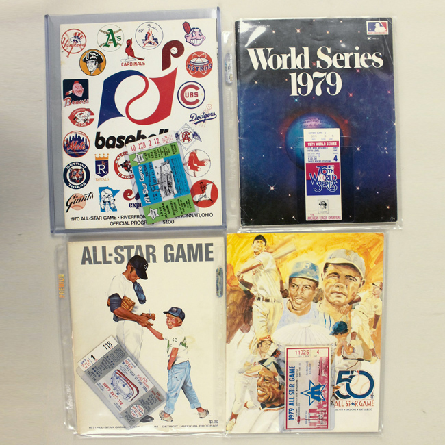 Description:Lot of (4) All-Star Game and World Series ticket stubs with programs (VG-NM). Incl. 1970 All-Star Game ticket stub (VG/EX) and program (EX/MT-NM, unscored); 1971 All-Star Game ticket stub (EX) and program (EX/MT, unscored); 1979 All-Star Game ticket stub (VG) and program (NM, unscored); and 1979 World Series Game 4 ticket stub (VG-VG/EX) and program (EX/MT, unscored). Range: VG-NM