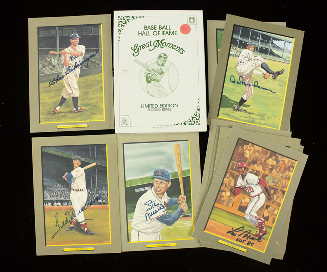Description:Lot of (15) signed Perez-Steele Great Moments cards, including Ted Williams (EX/MT-NM/MT). Incl. Ted Williams, Bob Feller with "HOF 62" inscription, Johnny Mize with "1981" inscription, Warren Spahn with "1973" inscription, Charlie Gehringer, Carl Hubbell, Hal Newhouser, Stan Musial, Lou Brock with "HOF 85" inscription, Monte Irvin with "1973" inscription, Jim Palmer with "HOF 1990" inscription, Ernie Banks, Fergie Jenkins, Willie McCovey, and Red Schoendienst. Signatures rate 8 to 10 out of 10: EX/MT-NM/MT