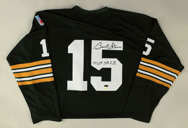 Description:Bart Starr signed and inscribed Green Bay Packers throwback jersey, TRI-STAR (NM). NFL Throwbacks Authentics 1969 style Packers #15 Bart Starr jersey signed by Starr in black marker with "MVP SB I, II" inscription. Signature rates 9/10 out of 10. Tri-Star serial #ed hologram sticker is affixed. No size tag is visible, but appears to be adult XL in size: NM