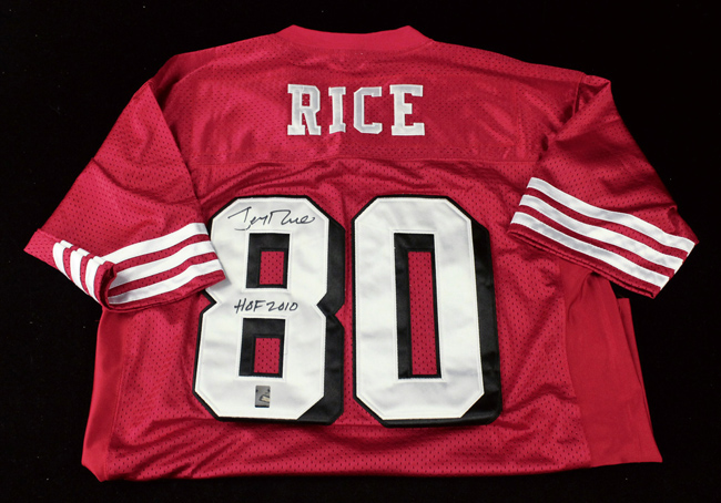 Description:Jerry Rice signed and inscribed San Francisco 49ers style jersey, Rice authenticated (NM). Size 50 #80 Jerry Rice jersey signed by Rice in black marker with "HOF 2010" inscription. Signature rates 9 out of 10. Jerry Rice serial #ed hologram sticker is affixed: NM