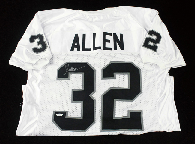 Description:Marcus Allen signed Los Angeles Raiders style jersey, JSA (NM). Size XL #32 Marcus Allen jersey signed by Allen in silver marker. Signature rates 9 out of 10. Comes with COA from JSA (serial #ed sticker is affixed): NM