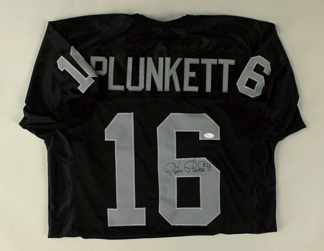 Description:Jim Plunkett signed Oakland Raiders style jersey, JSA (NM). Size XL #16 Jim Plunkett jersey signed by Plunkett in black marker. Signature rates 9 out of 10. Comes with COA from JSA (serial #ed sticker is affixed): NM