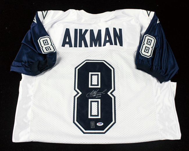 Description:Troy Aikman signed & inscribed Dallas Cowboys style jersey, PSA/DNA & Aikman authenticated (NM). Size XL #8 Troy Aikman jersey signed by Aikman in silver marker with "SB XXVII MVP" inscription. Signature rates 9 out of 10. Comes with COA from PSA/DNA (Troy Aikman and PSA/DNA stickers are affixed): NM