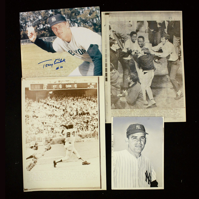 Description:Yogi Berra, Hank Aaron, and Willie Mays press photos with LOAs from PSA/DNA, plus Tony Kubek signed photo (VG/EX-NM). Incl. 5"x7" c.1958 Yogi Berra original Sport Magazine photo with LOA from PSA/DNA stating it as being a Type I photo (VG/EX-EX); 8"x11" c.1969 Hank Aaron AP photo with LOA from PSA/DNA stating it as being a Type III photo (EX-EX/MT); 8"x11" c.1973 Willie Mays AP photo with LOA from PSA/DNA stating it as being a Type III photo (EX/MT); and modern photo signed by Tony Kubek in blue marker with "#10" inscription rating 10 out of 10. Range: VG/EX-NM