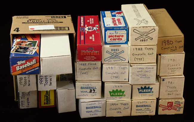 Lot of (26) Baseball card sets from 1980-1999 (NM overall). Incl. 1980 Topps, 1981 Donruss, 1981 Fleer, 1981 Topps, 1982 Donruss, 1982 Fleer, 1982 Topps, 1983 Fleer, 1987 Donruss, 1987 Fleer, 1987 Topps, 1988 Donruss, 1988 Fleer, 1988 Score, 1988 Topps, 1989 Topps, 1990 Topps, 1991 Topps, 1992 Topps, 1993 Topps, 1994 Topps, 1995 Topps, 1996 Topps, 1997 Topps, 1998 Topps, and 1999 Topps. It is presumed all sets are complete, but each has not been individually checked card by card: NM overall