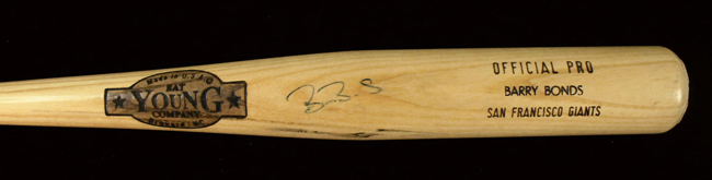 Description:Barry Bonds signed professional model baseball bat c.1996-99, PSA/DNA (EX). 34" Young Bat Co. BB Y20 Barry Bonds model bat with number "25" written on the knob and on the cupped end of the bat. Bonds signed the bat in blue marker. Signature rates 6/7 out of 10. PSA/DNA serial #ed sticker is affixed. Displays light usage wear, with rack marks visible: EX