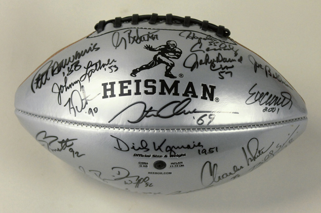 Description:Heisman Trophy winners multi-signed football with (19) autographs (NM). Reebok Heisman logo football signed by Marcus Allen, John Cappelletti, Hopalong Cassady, Pete Dawkins, Johnny Lattner, Gary Beban, Joe Bellino, Eric Crouch, John David Crow, George Rogers, Ty Detmer, Billy Sims, Danny Wuerffel, Charles White, Mike Rozier, Dick Kazmaier, Steve Owens, Gino Torretta, and Troy Smith, with most adding their Heisman year inscriptions. Signatures rate 8 to 9/10 out of 10: NM